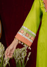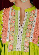 The kurta has a pleated yoke design with detailed embroidered lace in contrasting colors on the front panel and cuffs. The bright lime green color is eye-catching and fresh, ideal for day or evening wear. The kurta is adorned with small tassels along the hemline and sleeves, adding a playful touch.