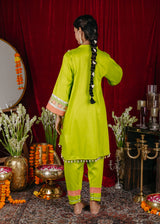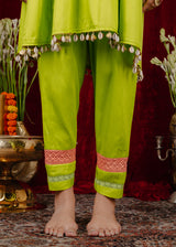 The pants are in the same lime green color, featuring embroidered bands at the cuffs that match the kurta's detailing. The flared fit provides comfort and ease of movement.