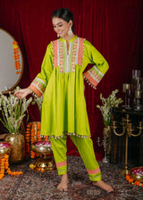 "Chakkraa Suhaavan Kurta Set." is crafted from pure cotton fabric, known for its comfort and breathability. The ensemble features a vibrant lime green color.