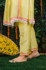 Stunning yellow pure silk chanderi kurta set adorned with beautiful laces and multicoloured shell detailing . Chakkraa Sunheri Kurta Set is best paired with Sunheri Dupatta.