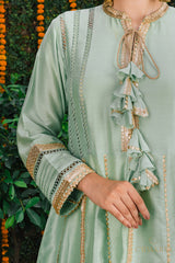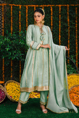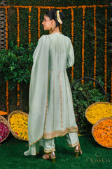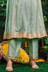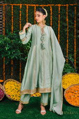 Stunning green pure silk chanderi kurta set adorned with stunning gold laces . Chakkraa Umrao Kurta Set is best paired with Umrao Dupatta.