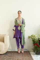 Step into timeless elegance with our Zariya kurta Set, crafted in luxurious silk chanderi. The deep purple kurta, paired with a classic salwar, is adorned with intricate thread embroidery in soothing pastel hues, giving it a regal yet graceful charm. The ensemble is beautifully complemented by a soft silk dupatta in sage green, adding the perfect balance of sophistication and freshness.