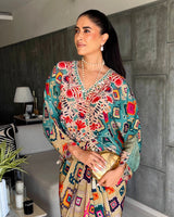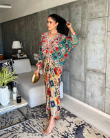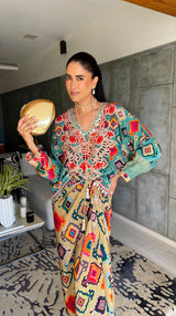 Turn heads with our Zyra Set, featuring a flowy crop kaftan top paired with a chic tie-knot skirt. Crafted from luxurious natural crepe, this ensemble combines comfort with bold artistry. The intricate prints and easy silhouette make it perfect for resort wear, festive evenings, or statement soirées.
