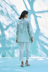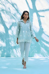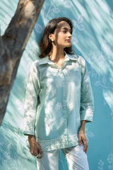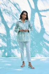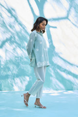 Effortless elegance meets everyday luxury. This co-ord set features a breezy, feather-light Mul Chanderi top adorned with delicate white embroidery, perfectly paired with tailored fine cotton trousers. Designed for the modern woman who values breathable sophistication during the golden summer months.
