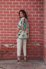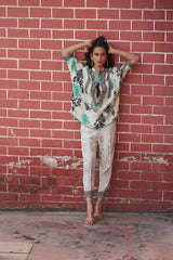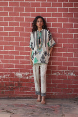 This natural crepe ensemble showcases a relaxed, kaftan-style top with intricate black and green tribal-inspired motifs, accented by a statement neckline. Paired with tapered pants featuring subtle patterns and a detailed hem, this look blends effortless elegance with bold design.