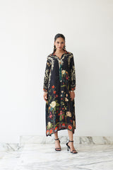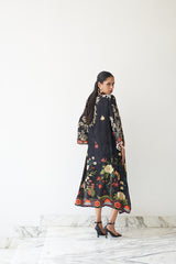 Unveil timeless charm with Zehra from our Nayaab collection. This stunning kaftan, crafted in flowy natural crepe and lined with a breathable cotton slip, features bold botanical prints against a midnight black canvas. With intricate detailing on the neckline and a play of rich hues & green tassels , Zehra transitions seamlessly from festive soirées to elegant evenings, embodying grace in every thread.