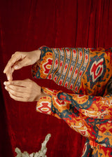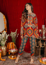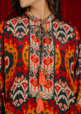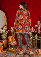 Chakkraa Allure Co-ord Set is a vibrant co-ord set featuring a bold, intricate pattern inspired by traditional Indian motifs. The set includes a loose-fitting top with long sleeves, adorned with a mix of rich colors including shades of orange, red, and teal on a dark base. The top is designed with a tasseled tie-up neckline and has a charming pom-pom lace trim along the hemline, adding a playful, festive touch.