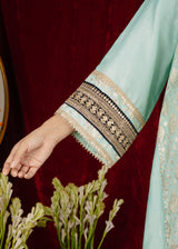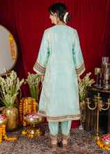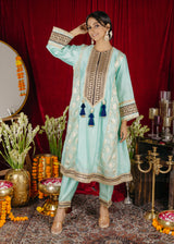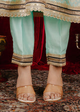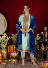 The kurta has a flowing silhouette with panels, adorned with intricate laces along the neckline, front, and borders. The light turquoise color is complemented by a deep blue dupatta. It is paired with the Kashmiri salwar which is designed to be comfortable and stylish, matching the kurta.The deep blue dupatta with gold accents adds a rich contrast to the outfit.