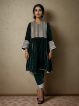 The outfit in this image is a luxurious dark green traditional ensemble, made of velvet. The kurta has a loose, flowing silhouette with intricate gold embroidery adorning the neckline, centre panel, sleeves, and hem. The detailed gold work gives the outfit a regal and ornate look, ideal for festive or formal occasions.