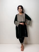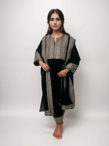 The sleeves are long and wide, adding an elegant touch with heavily embroidered cuffs. The kurta is paired with matching dark green kashmiri salwar finished with gold embroidery at the ankles, creating a cohesive and polished appearance. The combination of deep green and gold gives the outfit a timeless, classic appeal. The outfit is paired with a velvet green embroidered odhni.