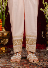 The Kashmiri salwar complements the kurta perfectly. It is in a matching light pink color and features intricate lace detailing at the ankle, adding to the overall elegance.