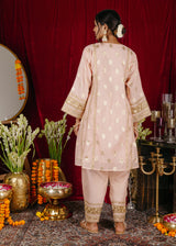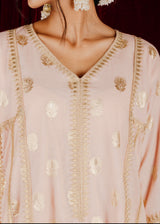 "Chakkraa Mastani Kurta Set." is crafted from pure silk chanderi fabric, renowned for its luxurious texture and elegant drape. The ensemble features a light pink colour.
