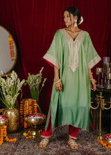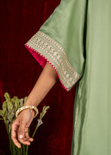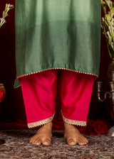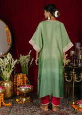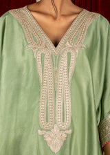 Panna Choga Set is a traditional and elegant ensemble made from pure silk Chanderi fabric in shaded hues of lovely greens. It features a kaftan choga style with intricate embroidery, paired with a contrasting Rani pink Kashmiri salwar. The outfit is priced at ₹15,000/-. The overall aesthetic is luxurious, with a combination of rich fabrics and detailed craftsmanship, perfect for festive or special occasions.