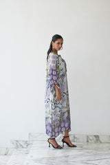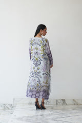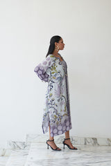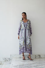 Let grace lead the way in Raahi from our Nayaab collection. Crafted in breezy natural crepe and paired with a pure cotton slip, this kaftan features a harmonious blend of lavender tones, floral motifs, and playful polka accents. Finished with mirror tassel detailing and a flattering neckline, Raahi is perfect for get-togethers, leisurely brunches, or serene festive moments.