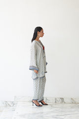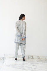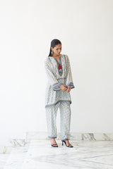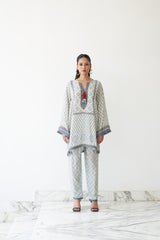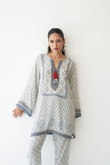 Crafted in natural crepe, Saaz blends delicate prints with effortless tailoring. The soothing tones and intricate detailing make it a versatile piece from our Nayaab collection — where every thread hums a note of quiet elegance.