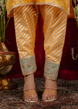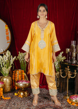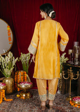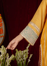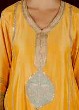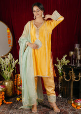 "Chakkraa Zard Kurta Set." is crafted from pure silk chanderi fabric, which is known for its delicate texture and sheen priced at ₹14,500/-, this ensemble features a kalidar kurta paired with a diagonal Kashmiri salwar. The kurta has a flowing silhouette with multiple panels, featuring intricate embroidery along the neckline, front, and sleeves. The vibrant mustard yellow color is paired with a pure silk light green dupatta.