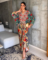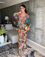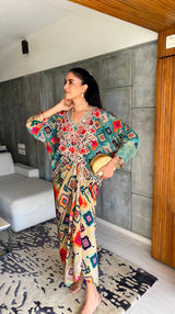 Turn heads with our Zyra Set, featuring a flowy crop kaftan top paired with a chic tie-knot skirt. Crafted from luxurious natural crepe, this ensemble combines comfort with bold artistry. The intricate prints and easy silhouette make it perfect for resort wear, festive evenings, or statement soirées.