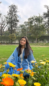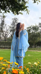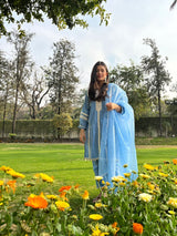 • Lovely blue pure silk chanderi kurta set embellished with stunning laces & shell detailing. Chakkraa Aasman Kurta Set is best paired with Aasman Dupatta.