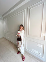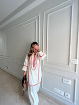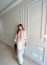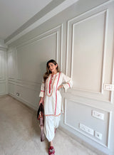Rang Kurta Set ethnically styled in pure fine cotton fabric and embellished with mirror work laces, multi coloured bead tassels and hangings to give a formal look to your esteemed self. It is best paired with Rang pleated high salwar adorned with mirrors . Contrast Organza Dupatta surfaced with mirror work edging adds additional element to the look.