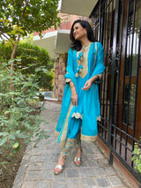 Stunning turquoise pure silk chanderi kurta set adorned with stunning gold laces . Chakkraa Paakezah Kurta Set is best paired with Paakezah Dupatta.