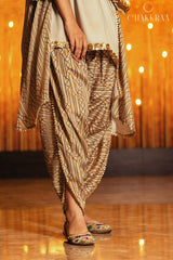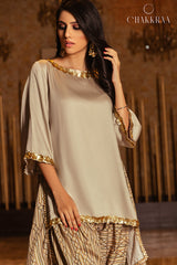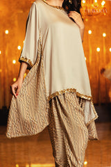 Super chic, asymmetrical kurta made with 100% glazed cotton print and Italian cotton fabric. Its round neckline is embellished with golden sequence lace which also sits beautifully on the sleeves and the bottom of the kurta.