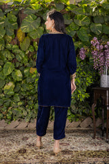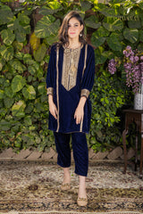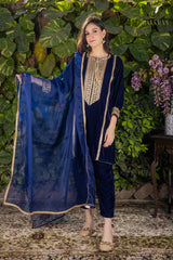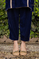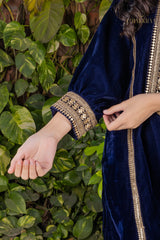 Beautiful blue velvet kurta set embellished with stunning gold laces and straight pants . Chakkraa Kaasani Kurta Set is best paired with Kaasani Dupatta.