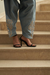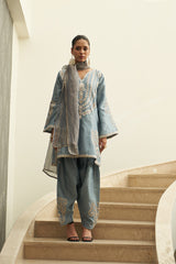 Bold, graceful, and steeped in heritage, Sitaara is a timeless kurta salwar set crafted in rich silk chanderi. The blueish grey kurta is delicately embroidered with whits and gold threadwork, radiating understated grandeur. Its paired Kashmiri salwar, with intricate detailing on the cuffs, brings cultural craftsmanship to the forefront.
