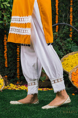 Made out of pure cotton and embellished with beautiful lace, it's super comfortable and stylish. Gazal white harem pants are best paired with Gazal velvet kurta.