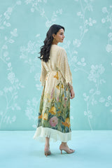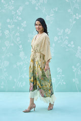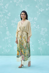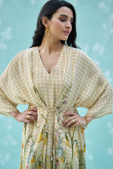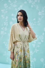 Define your silhouette with this exquisite wrap dress, masterfully tailored from premium natural crepe. The design seamlessly marries a classic gingham check with an intricate, painterly floral botanical print, finished with delicate fringe detailing. A timeless piece that offers an air of refined, effortless elegance for any elevated occasion.