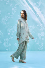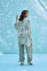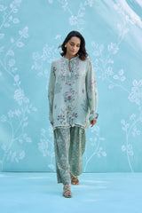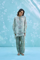 The Flora Skirt set is a masterclass in effortless luxury. This two-piece set is crafted from premium natural crepe, offering a beautiful, fluid drape that moves with you. Featuring a sophisticated botanical print of delicate wildflowers, the tunic is accented with a scalloped fringe hem and artisanal tassel ties
