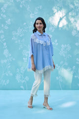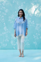 Embrace effortless summer sophistication with this exquisite co-ord set. The breezy, high-quality mul chanderi top is elevated by delicate, intricate lace embroidery, perfectly complemented by relaxed-fit pants in premium, breathable cotton. Designed for those who value refined aesthetics and comfort, this ensemble is a seamless blend of artisanal craftsmanship and contemporary style.