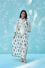 Embrace effortless summer charm in this breathable, ultra-soft mul chanderi dress. Featuring a delicate, hand-blocked botanical print and a sophisticated tie-up neckline, this lightweight piece is designed for elegant comfort on sun-drenched days.