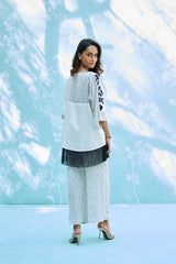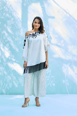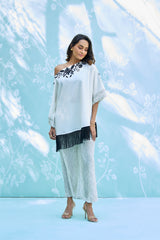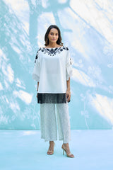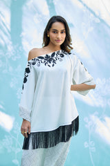 Elevate your summer aesthetic with this striking, contemporary ensemble. Featuring a buttery-soft pure cotton top with bold, artisanal embroidery and playful fringe detailing, perfectly balanced by relaxed-fit printed natural pants. A seamless blend of comfort and high-fashion flair for the modern wardrobe.