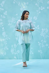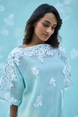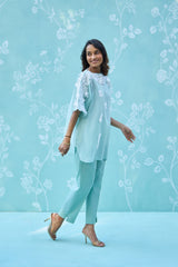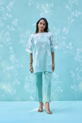 Embrace a sense of weightless elegance with the Aira co-ord set. This ensemble features a boat-neck tunic crafted from super-soft Mul Chanderi, offering a delicate, translucent texture and a sophisticated mint-green hue.