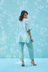 The top is beautifully defined by intricate white floral lace that spans the neckline and wide sleeves, creating a soft, romantic frame. For ultimate functionality and comfort, the set is paired with tailored pure cotton pants in a matching mint tone, ensuring a breathable, structured fit for all-day wear.