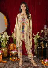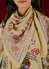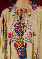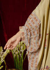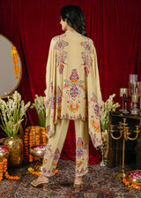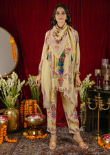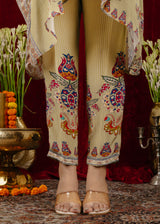 The Chakkraa Charisma Co-ord Set is an exquisite traditional ensemble made from luxurious natural crepe, embodying timeless elegance and rich cultural heritage. The long asymmetrical top, in a soft green hue, is adorned with intricate multicolored floral and geometric motifs that exude artistic charm. The design features delicate vertical stripes that add a sophisticated texture to the fabric. The ensemble is elevated by a matching scarf draped gracefully over the shoulders, embellished with elaborate borders and tassels in vibrant green, adding a regal touch. Complementing the top are matching pants that mirror the tunic's intricate patterns, creating a cohesive and refined look.